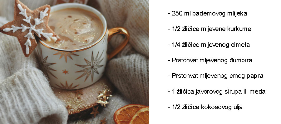 Nakon jutarnjeg mira, vrijeme je za nešto toplo i hranjivo. Napitak koji grije iznutra i ima gotovo terapeutski učinak – topla zlatna latte mješavina s kurkumom i bademovim mlijekom. Priprema je jednostavna, a okus savršeno uravnotežen – nježan, začinski i umirujuć.