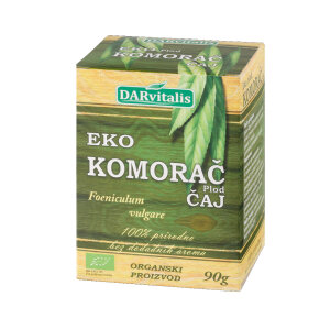 plod komorača* (Foeniculum vulgae). *ekološki uzgoj. Kodni broj: HR-EKO-05. Proizvodi: DARvitalis d.o.o., Palagruška 16, 10000 Zagreb, Republika Hrvatska. Upute za pripremu: 1 punu čajnu žličicu (cca 2,6 g) preliti s 5 dl vode, kuhati 3 minute i ostaviti u pokrivenoj posudi 10 minuta, povremeno promiješati i procijediti. Svježe pripremljeni čajni napitak preporučuje se popiti 2 puta dnevno. Najbolje upotrijebiti do: otisnuto na ambalaži. Uvjeti čuvanja: čuvati na suhom i tamnom mjestu u zatvorenoj ambalaži.