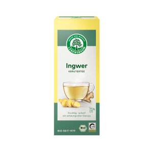 đumbir iz ekološkog uzgoja. Neto količina: 30 g (20 x 1,5 g). Kodni broj: DE-ÖKO-001, ne EU poljoprivreda. Stavlja na tržište RH: Biovega d.o.o., Majstorska 1E, 10000 Zagreb, Hrvatska. Najbolje upotrijebiti do kraja / LOT broj: otisnuto na ambalaži. Uvjeti čuvanja: čuvati na suhom mjestu. Upute za uporabu: jedna vrećica čaja po šalici. Prelijte svježe prokuhanom, vodom i pustite da odstoji 8 minuta, te nježno istisnite vrećicu kako bi se oslobodili aktivni sastojci.