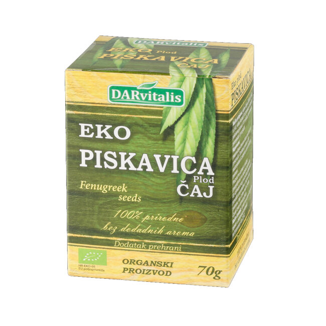 sjeme piskavice* (Trigonella foenum graecum). *ekološki uzgoj. Sastojci u preporučenoj dnevnoj dozi (3 čajne žličice = 12 g): sjeme piskavice* (Trigonella foenum graecum) 12 g. Čaj piskavica, dodatak prehrani. Ekoproizvod. Kodni broj: HR-EKO-05. Neto koičina: 70 g. Proizvodi: DARvitalis d.o.o. Palagruška 16, 10000 Zagreb, Republika Hrvatska. Upute za uporabu: jednu čajnu žličicu preliti s 5 dl vode, kuhati 7-10 minuta i ostaviti u pokrivenoj posudi 10 minuta, povremeno promiješati i procijediti. Napomene: preporučene dnevne doze ne smiju se prekoračiti. Proizvod ne uzimati u slučaju preosjetljivosti na sastojak pripravka. Proizvod nije nadomjestak ili zamjena uravnoteženoj prehrani. Uz uzimanje ovog proizvoda potrebno je provoditi uravnoteženu i raznovrsnu prehranu, kao i zdrav način života. Čuvati izvan dohvata djece. Upozorenje: ne preporučuje se uzimanje duže od 2 tjedna u kontinuitetu. Osobe koje uzimaju lijekove trebaju se prije uzimanja posavjetovati s liječnikom. Ne preporučuje se trudnicama. Način čuvanja: čuvati na suhom i tamnom mjestu u zatvorenoj ambalaži. Najbolje upotrijebiti do: otisnuto na ambalaži.