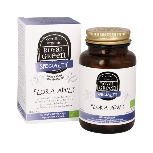 Royal Green Flora Adult, certificirani organski probiotik koji sadrži 20 različitih sojeva bakterija, ukupno 3 milijarde aktivnih bakterija po kapsuli koje pomažu u održavanju zdrave crijevne mikroflore.