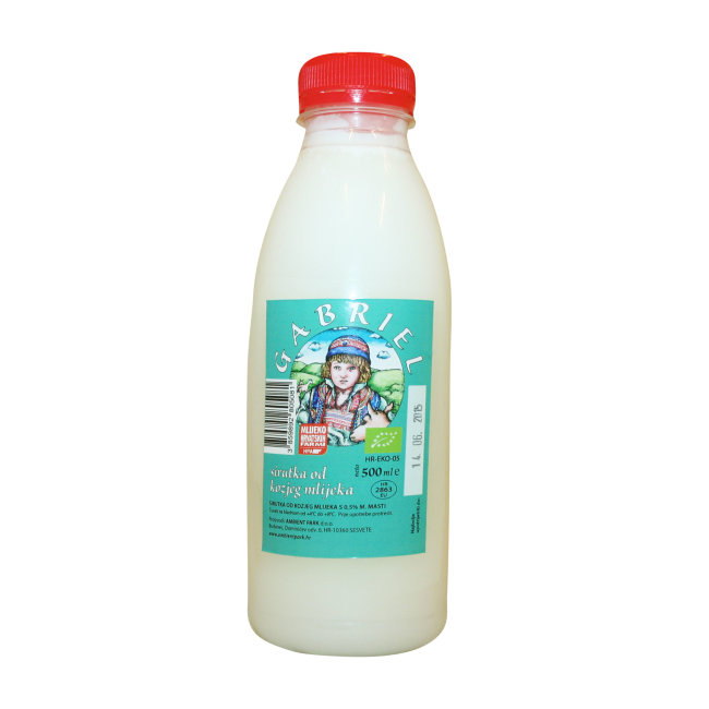kozje MLIJEKO, sirilo, sirna kultura. Zemlja podrijetla: Hrvatska. Kodni broj: HR-EKO-05, uzgojeno u Hrvatskoj. Proizvođač: Ambient Park d.o.o., Dominićev odvojak 6, Budenec, 10 360 Sesvete, Hrvatska. Uvjeti čuvanja: čuvati u hladnjaku na temperaturi do +8°C. Upotrijebiti do: otisnuto na ambalaži. Povratna naknada 50 lipa.