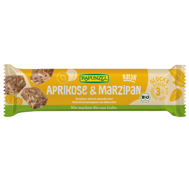marcipan od meda* 40% (BADEMI* 53%, med*), sušene marelice* (marelice*, rižino brašno*), prženi BADEMI* 30%. *ekološki uzgoj. Može sadržavati GLUTEN, SOJU, MLIJEKO, ostalo ORAŠASTO VOĆE, SEZAM i tvrde komadiće (ljuske badema ili koštice marelice) u tragovima. Neto količina: 50 g (3 komada). Kodni broj i podrijetlo sirovine: otisnuto kod eko znaka. Stavlja na tržište RH: Biovega d.o.o., Majstorska 1E, 10 000 Zagreb, Hrvatska. Najbolje upotrijebiti do / LOT broj: otisnuto na ambalaži.