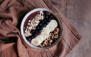 Ujutro stavite u blender chiu sa zobenim mlijekom, banane, 3 male žlice bademovog namaza, 2 male žlice divlje borovnice u prahu i 1 malu žlicu acai praha.