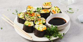 Pomiješajte tahini i umeboshi pastu. Na udaljenosti približno 4 cm od vama bližeg ruba nori alge nanesite po širini smjese tahinija i umeboshi paste pa poslažite povrće, seitan, tofu ili tempeh. Sushi se radi kao i rolada. Prvo odignite bliži rub sushimata i alge pa nastavite rolati algu koristeći sushimat samo kao vanjsko pomagalo da lakše možete stisnuti algu. Ponovno umotajte svitak u sushimatu i čvrsto pritisnite.