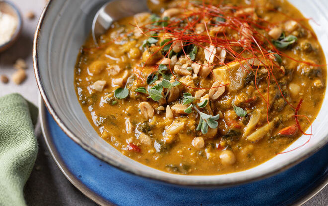 - Zatim u lonac slaži red tofua, red krumpira, posipaj solju, paprom i peršinom — i tako dok ne potrošiš sve sastojke. Zalij vodom tako da sve bude prekriveno i pusti da zakipi. Kada zakipi, smanji vatru, dodaj još malo vode po potrebi i ulij napitak od soje. Kuhaj 45 minuta do sat vremena, ovisno o debljini krumpira — krumpir se treba gotovo raspasti kako bi pustio škrob i dao jelu onu poznatu, kremastu teksturu.