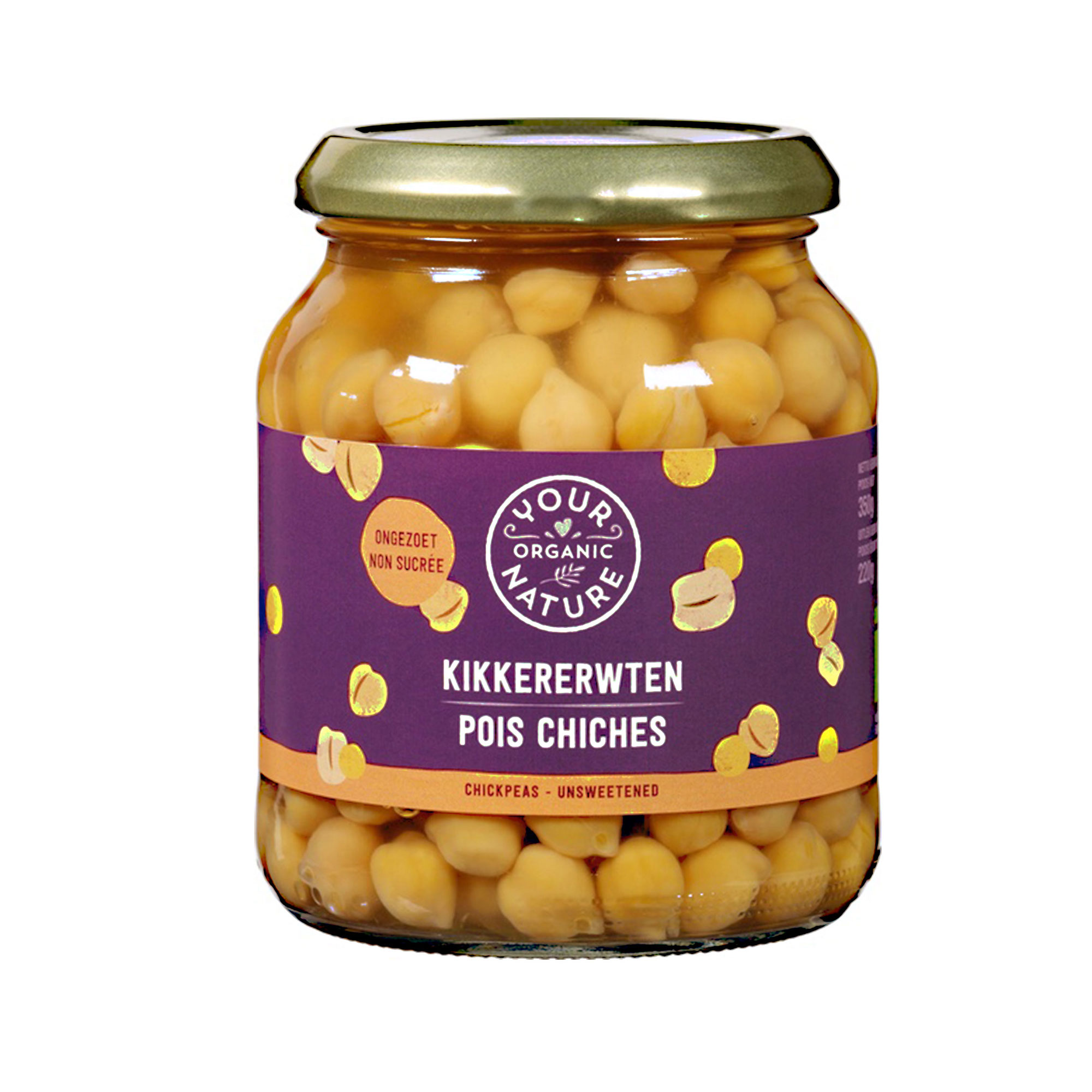 slanutak* 62,9%, voda, morska sol. *ekološki uzgoj. Neto količina: 350 g. Ocijeđena neto masa: 220 g. Kodni broj: NL–BIO–01. Stavlja na tržište RH: Biovega d.o.o., Majstorska 1E, 10000 Zagreb, Hrvatska. Najbolje upotrijebiti do: otisnuto na poklopcu. Uvjeti čuvanja i uporabe: nakon otvaranja čuvati u hladnjaku i konzumirati u roku od 2 dana. Ne kuhati, po potrebi samo podgrijati. Ostale prosječne hranjive vrijednosti na 100 g proizvoda: vlakna: 7,1 g