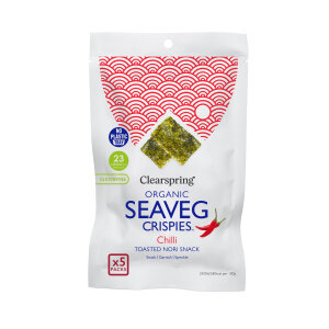 Za sve ljubitelje morskih okusa idealna hranjiva grickalica! Ovaj snack spravljen je od tostirane nori alge iz strogo kontroliranog uzgoja u čistim vodama korejskih obala. Kratko je tostirana i začinjena nerafiniranom morskom soli, organskim suncokretovim uljem i čilijem. Idealna je za grickanje tijekom dana, ali i za pripremu sushija ili salata. Clearspring proizvodi provjerene su ekološke kvalitete, ne sadrže umjetne dodatke, MSG, bojila, konzervanse niti dodani rafinirani šećer i pogodni su za vegane.