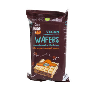 Organski vafli bez šećera punjeni kremom od kakaa i lješnjaka, zaslađeni datuljama. Odličan su slatki veganski međuobrok ili snack.